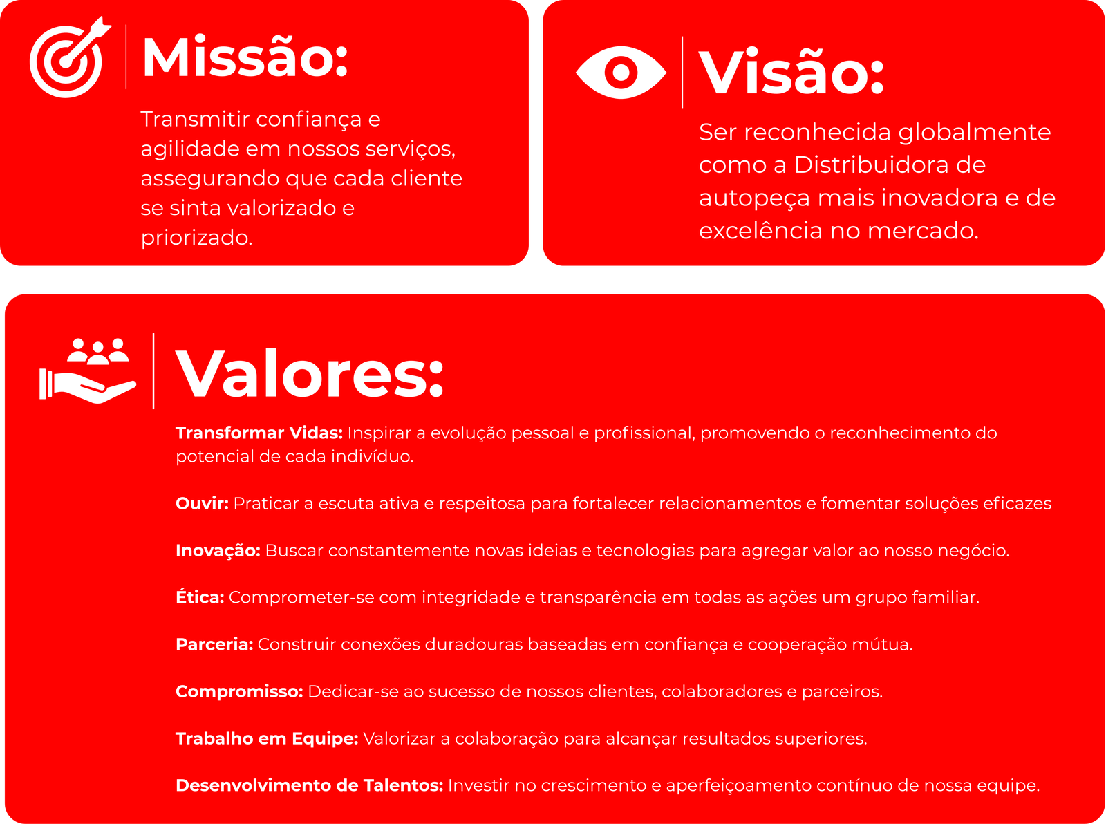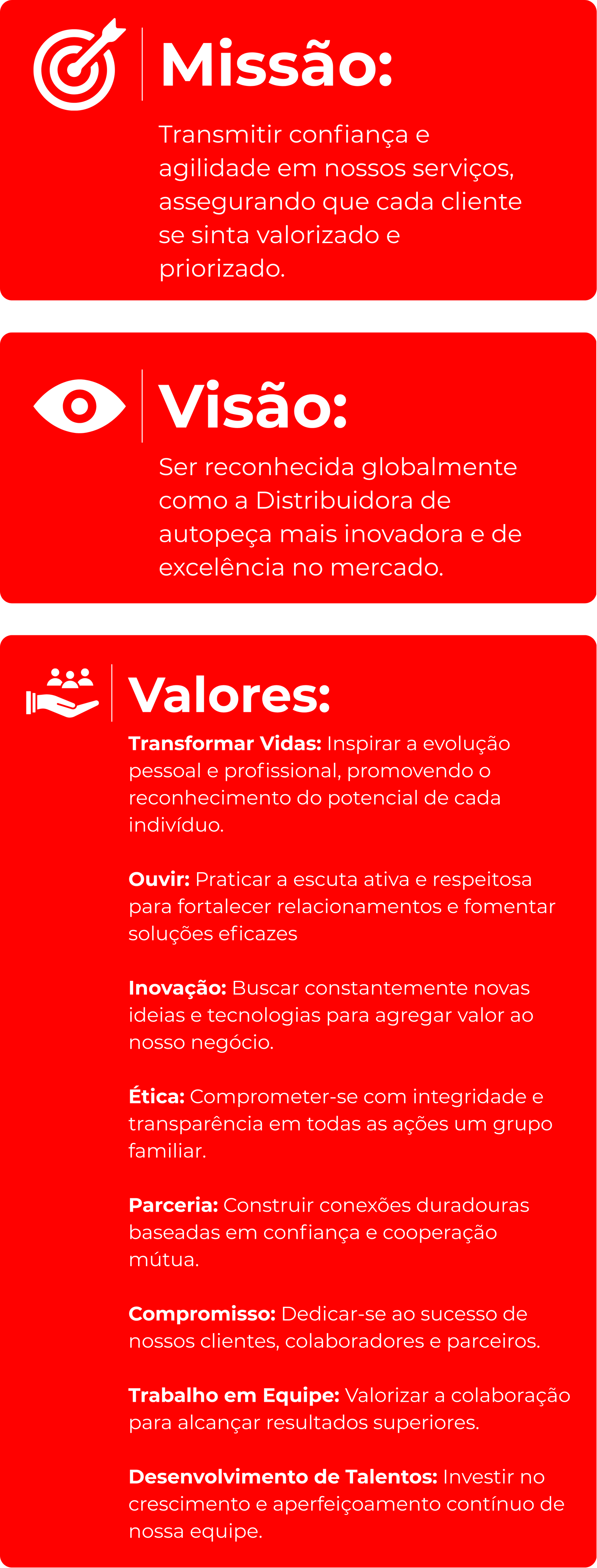 Na J.L.O Atacadista, acreditamos que o sucesso se constrói com base em valores sólidos como integridade, inovação e respeito. Estamos em constante evolução para acompanhar as mudanças do mercado, sempre com o objetivo de oferecer o melhor em peças automotivas.